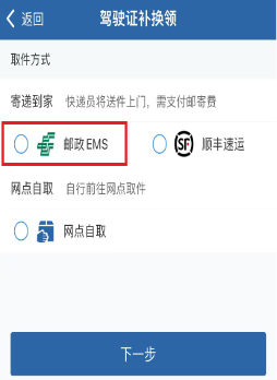 4、选择“邮政EMS或顺丰速运”添加“邮寄地址”,点击“下一步”缴纳工本费及邮寄费。
