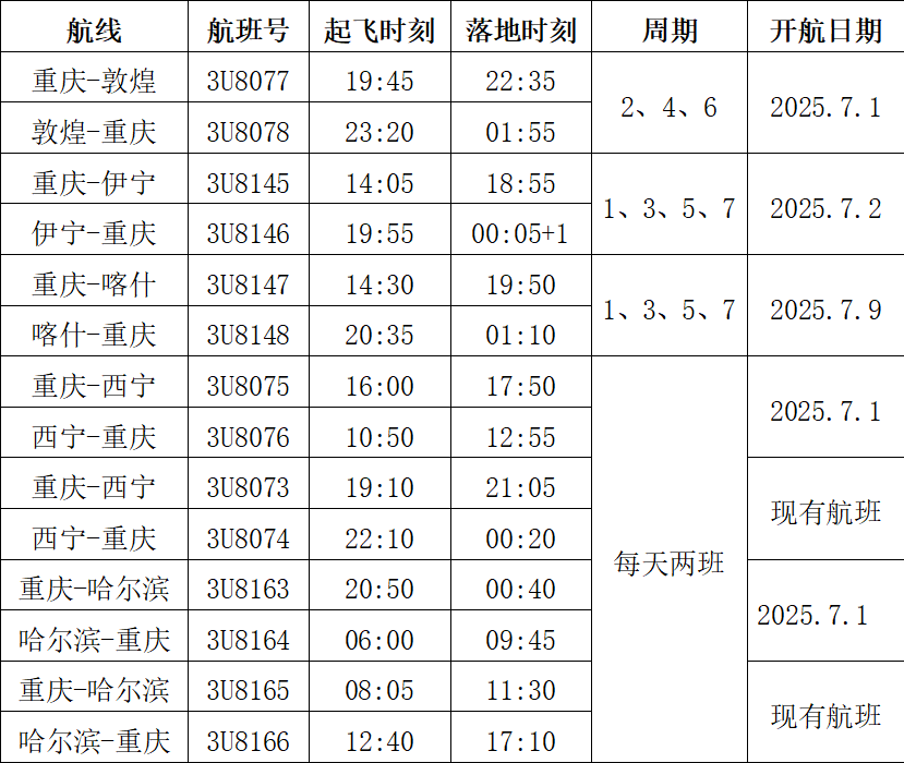 6月26日,四川航空发布消息,为进一步满足广大旅客暑期对西北旅游目的地的出行需求,四川航空将于近日新开重庆至敦煌、伊宁、喀什航线,同时将重庆至西宁、哈尔滨航线由每天一班加密至每天两班。