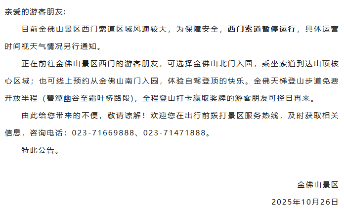 10月26日上午,金佛山景区发布公告,金佛山景区西门索道区域风速较大,为保障安全,西门索道暂停运行,具体运营时间视天气情况另行通知。