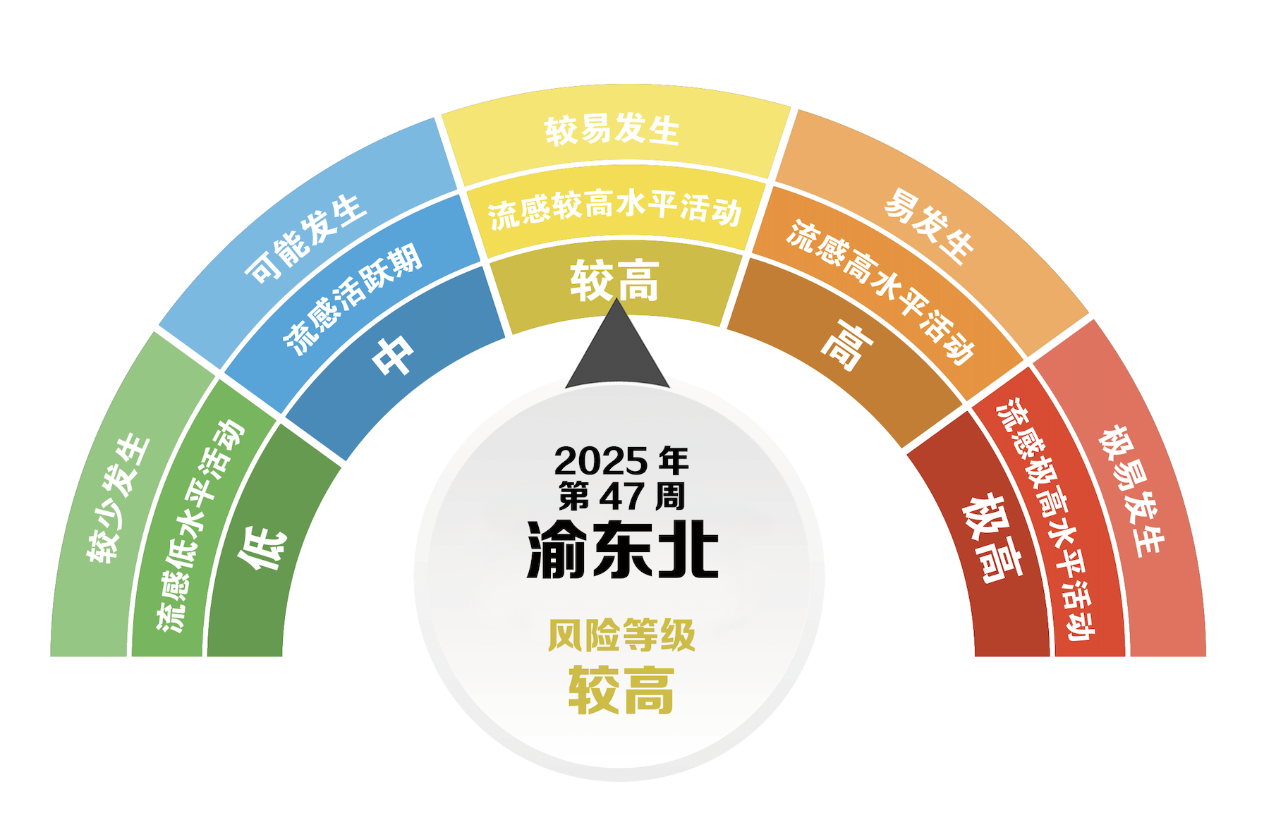 11月18日,重庆市疾控中心联合重庆市气象服务中心,发布2025年第47周重庆市“流感风险等级与防控建议”。其中,全市流感风险等级为较高,中心城区进入流感流行高峰期。