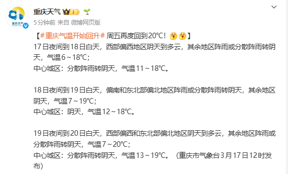 这两天早上出门,是不是觉得凉飕飕的?别急!据重庆市气象台12时发布的消息,重庆气温开始回升,周五再度回到20℃。