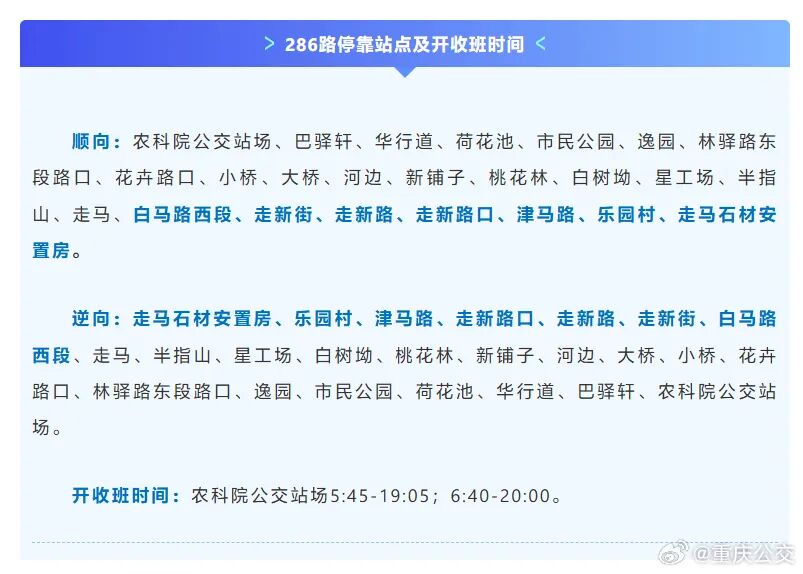 据“重庆公交”官方账号消息,近日,286线公交优化调整,线路从走马站延伸至走马石材安置房,沿途新增白马路西段、走新街、走新路、走新路口、津马路、乐园村、走马石材安置房共7对停靠站,线路总里程由原来的12.5公里增至16.5公里,惠及走马镇上万名居民出行。