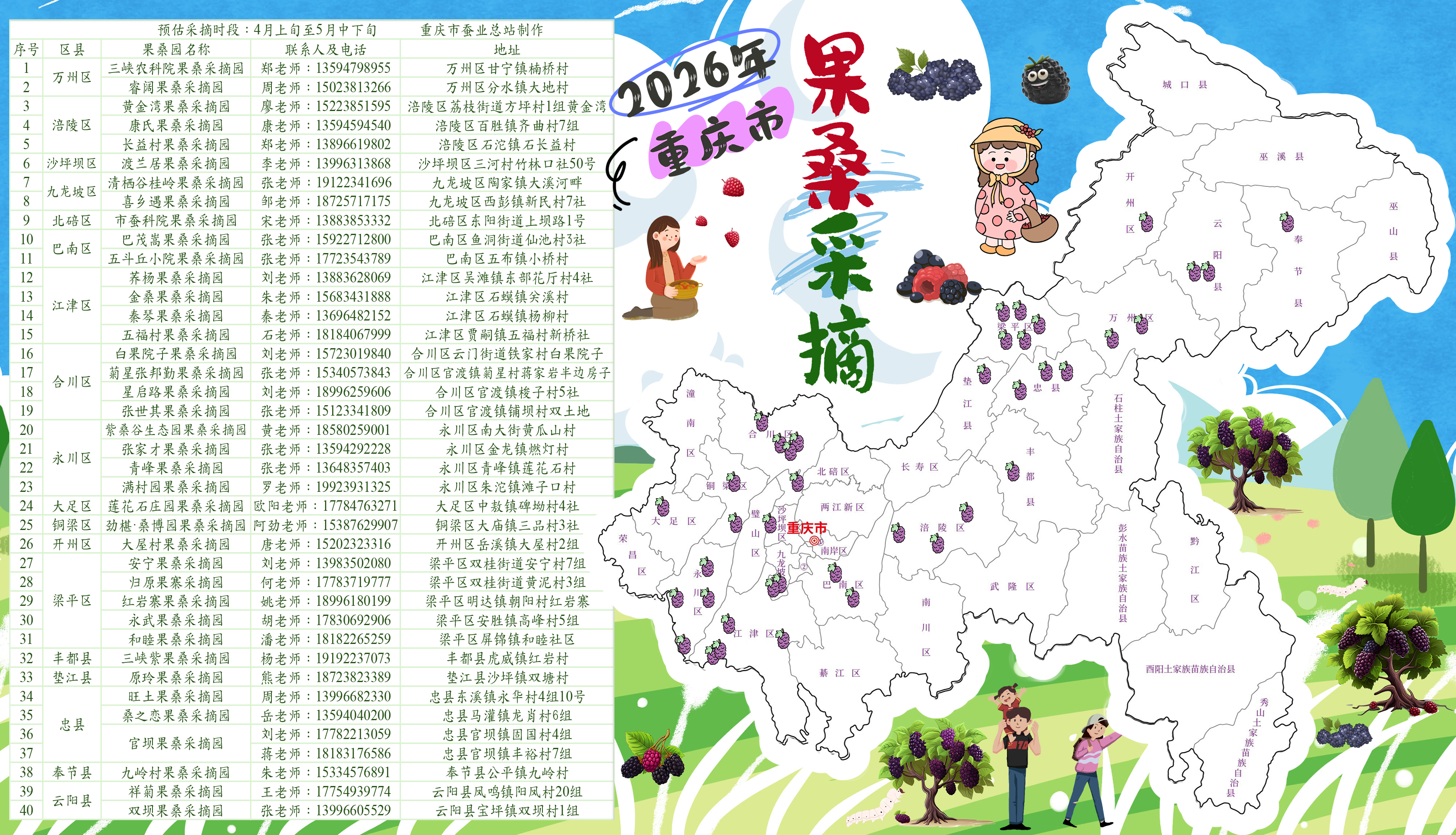 据了解,本次公布的采摘点位覆盖万州、涪陵、沙坪坝、九龙坡、北碚、巴南等多个区县,园区交通便捷、果桑品种优质、果实饱满多汁,是亲子研学、家庭休闲、近郊打卡、乡村体验的优选目的地。