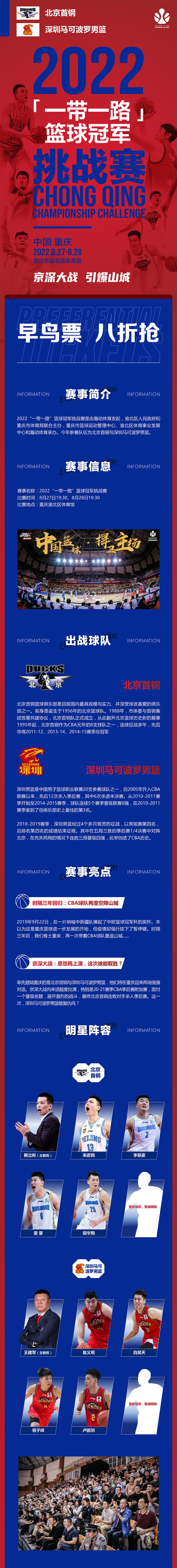 8月3日,据重庆市体育局消息,2022“一带一路”篮球冠军挑战赛将于8月27-28日晚上7点半在重庆渝北区体育馆拉开战幕。该赛事由渝北区人民政府和重庆市体育局联合主办,重庆市篮球运动管理中心、渝北区体育事业发展中心和瀚动体育承办,今年参赛队伍为北京首钢与深圳马可波罗男篮。