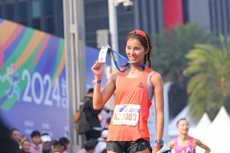 2024重庆马拉松女子组中国籍选手焦安静冲线。见习记者 李雨恒 摄
