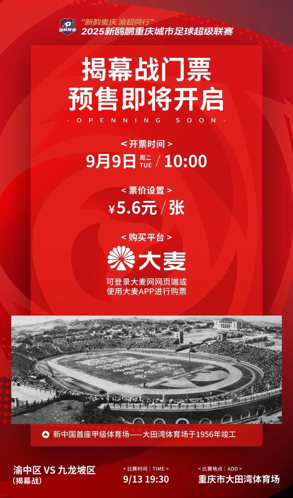 “渝超”揭幕战由渝中区队对阵九龙坡区队。值得一提的是,这是大田湾体育场自2003年甲A以来首次举办大型足球赛事。本场比赛门票将于9月9日上午10点正式开售,票价仅为5.6元一张。球迷朋友们可以通过登录大麦网网页端或使用大麦APP搜索“重庆城市足球超级联赛”购票。