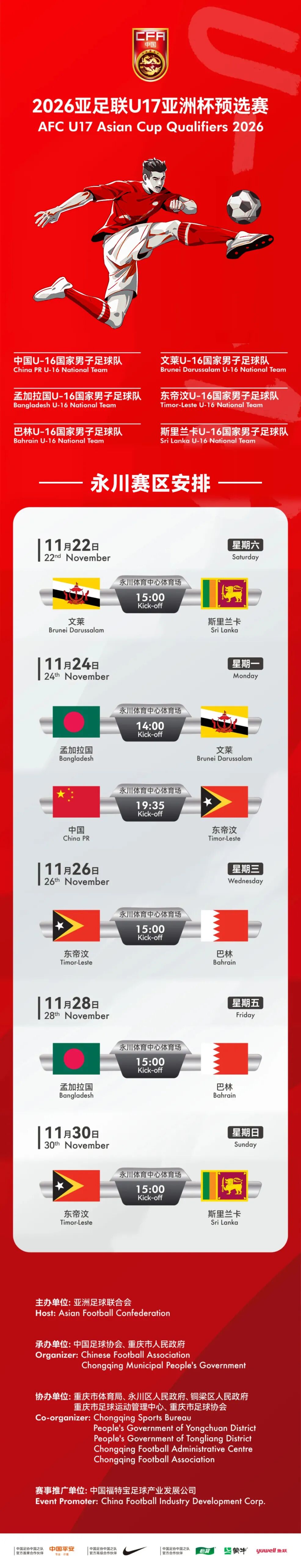 U17亚洲杯预选赛,不仅是竞技的舞台,更是永川向世界展示的窗口,我们正用一场足球盛宴点燃城市活力,升腾人间烟火!11月22日起,永川体育中心“2026年亚足联U17亚洲杯”预选赛,我们不见不散!