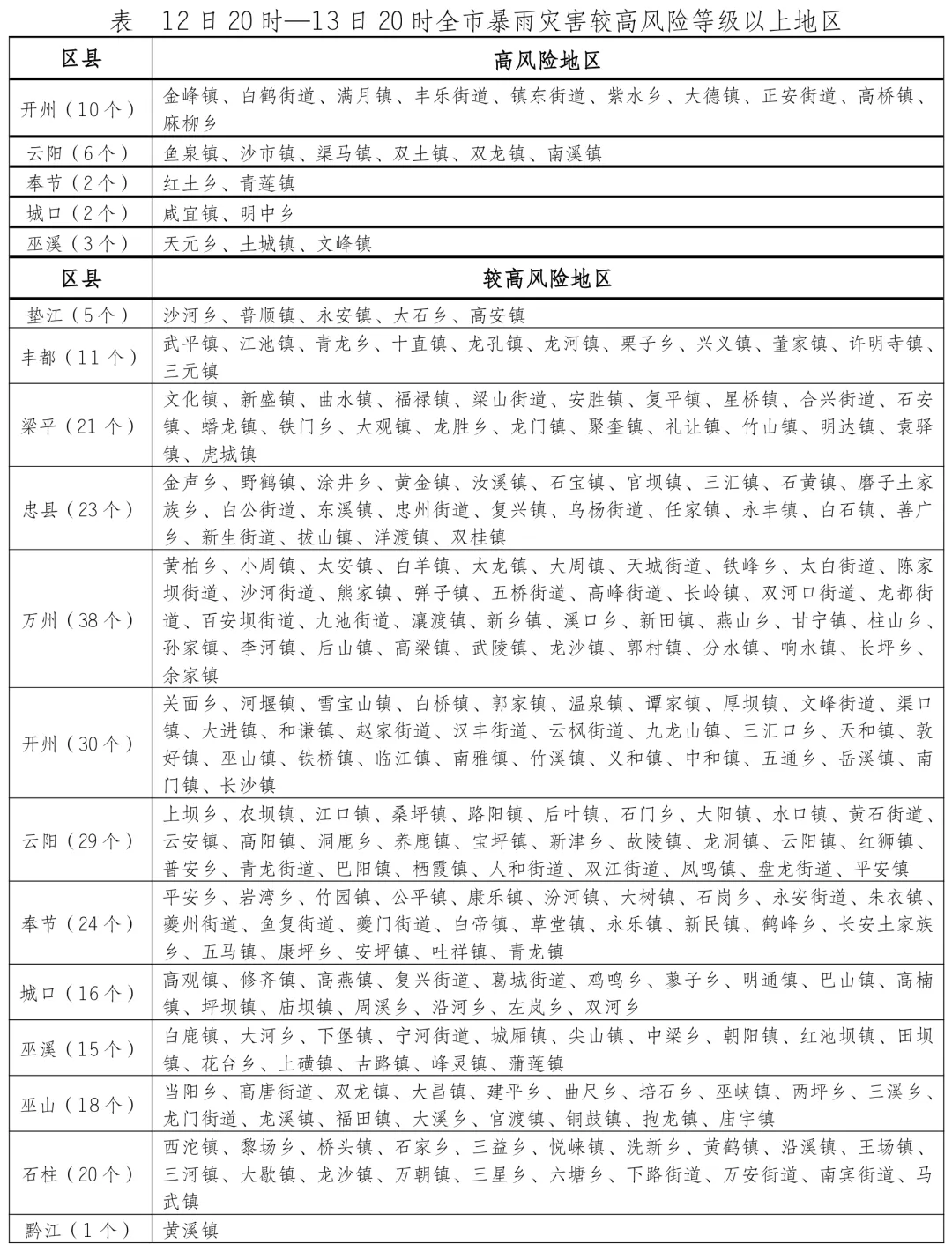 风险高:万州、开州、云阳、奉节、城口、巫溪。