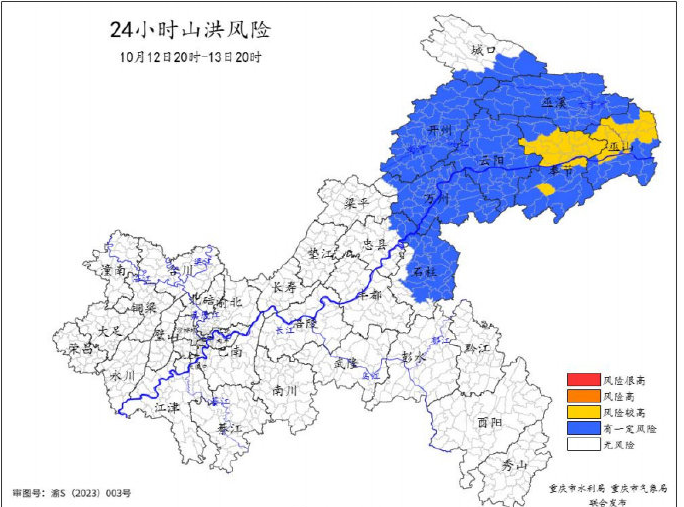重庆市水利局和重庆市气象局联合发布小流域山洪灾害气象风险预警:预计10月12日20时-10月13日20时,9个区县部分乡镇有小流域山洪灾害气象风险,其余区县也可能因局地短时强降雨引发小流域山洪灾害。