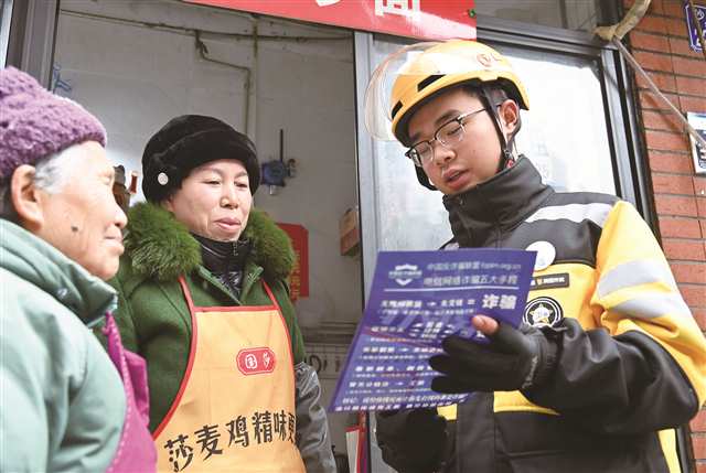 渝碚路街道汉渝路社区,“红岩骑手”喻文博在向老人们发放防电诈宣传单