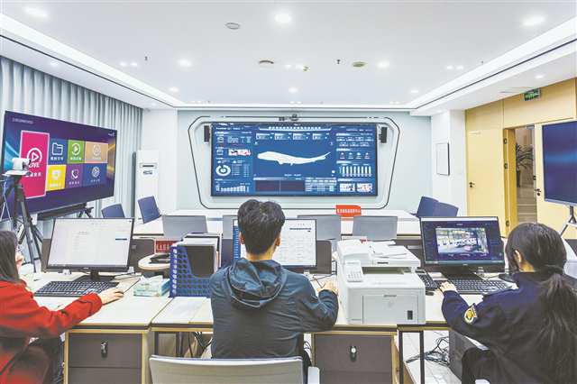 化龙桥街道指挥中心的工作人员查看数智助企场景 摄/李显彦