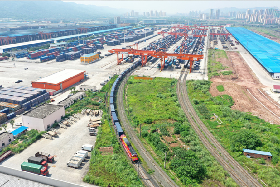 一趟满载货物的重庆中欧班列缓缓驶出团结村场站。