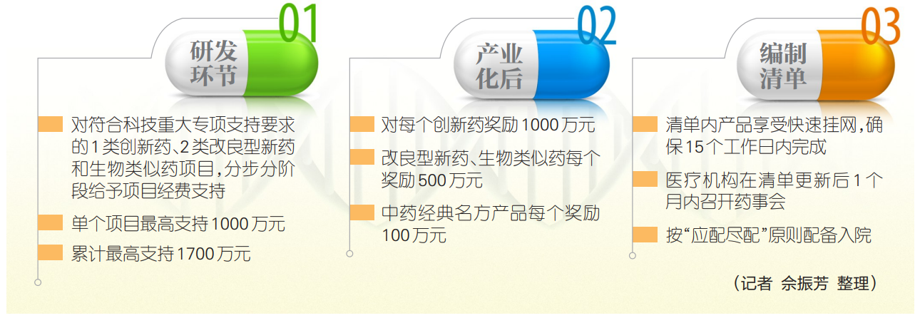 完成研发并实现产业化后,将给予额外奖励:对每个创新药奖励1000万元,改良型新药、生物类似药每个奖励500万元,中药经典名方产品每个奖励100万元。对于成功实现市场开拓的创新药,其成果海外权益许可交易可按首付款的3%获得最高500万元奖励。