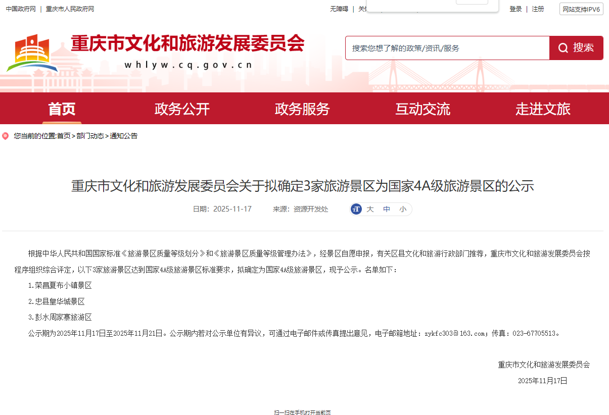 重庆4A级旅游景区有望再增3个。11月17日,重庆市文化和旅游发展委员会发布《关于拟确定3家旅游景区为国家4A级旅游景区的公示》(以下简称公示)。