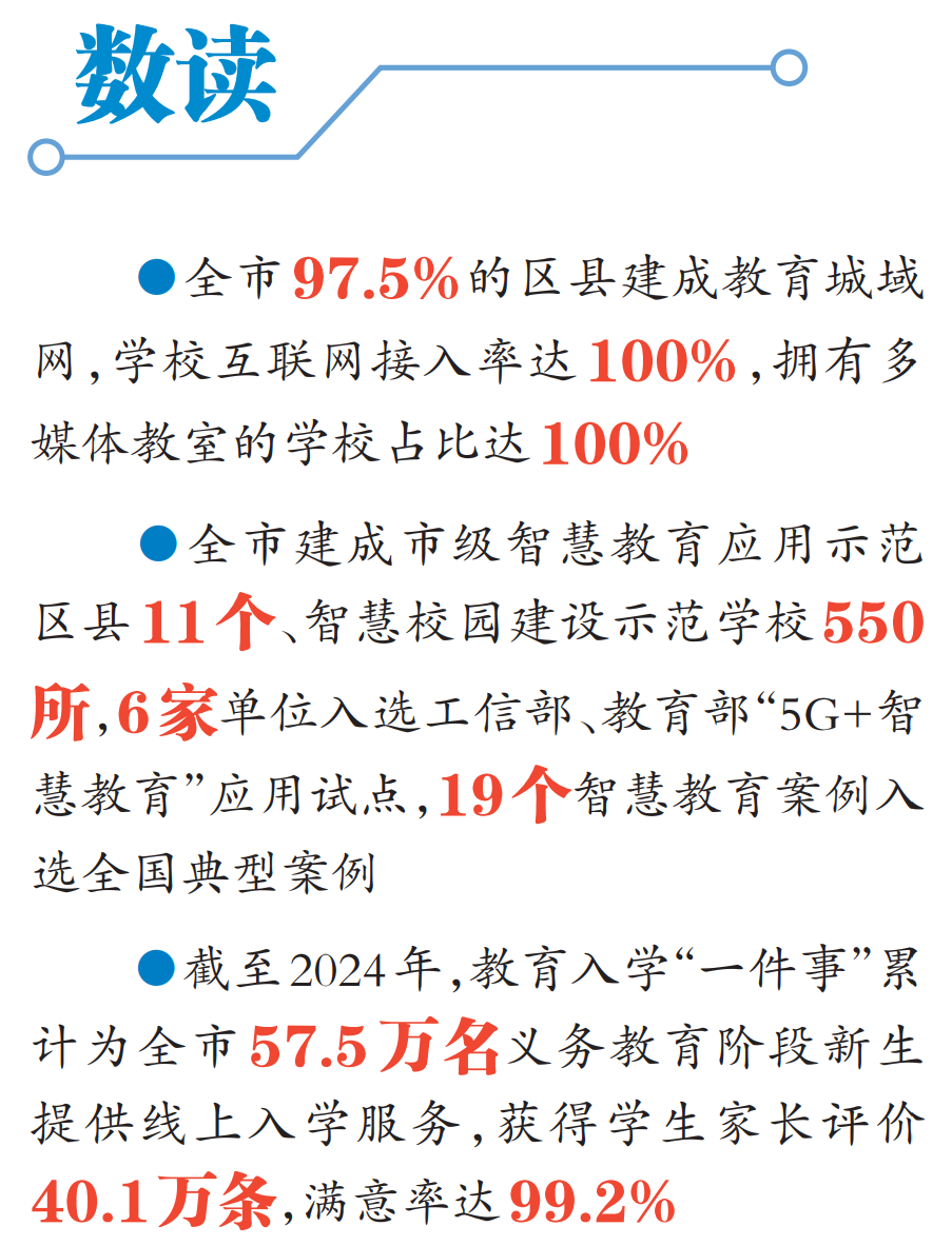 围绕打造全场景、全链条数字教育应用体系,重庆谋划建设“惠学生”“数智强师”“校园智治”“渝有优教”“智汇产教”5大教育综合应用。目前这5大应用已全部进入数字重庆建设重大应用“一本账”。