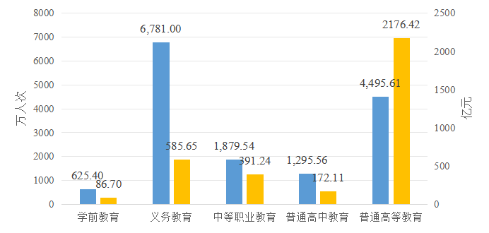 学前教育资助财政资金投入80.21亿元,占学前教育资助资金总额的92.51%;义务教育资助财政资金投入581.73亿元,占义务教育资助资金总额的99.33%;中等职业教育资助财政资金投入385.63亿元,占中等职业教育资助资金总额的98.57%;普通高中教育资助财政资金投入160.23亿元,占普通高中教育资助资金总额的93.10%;普通高等教育资助财政资金投入1007.91亿元,占普通高等教育资助资金总额的46.31%。