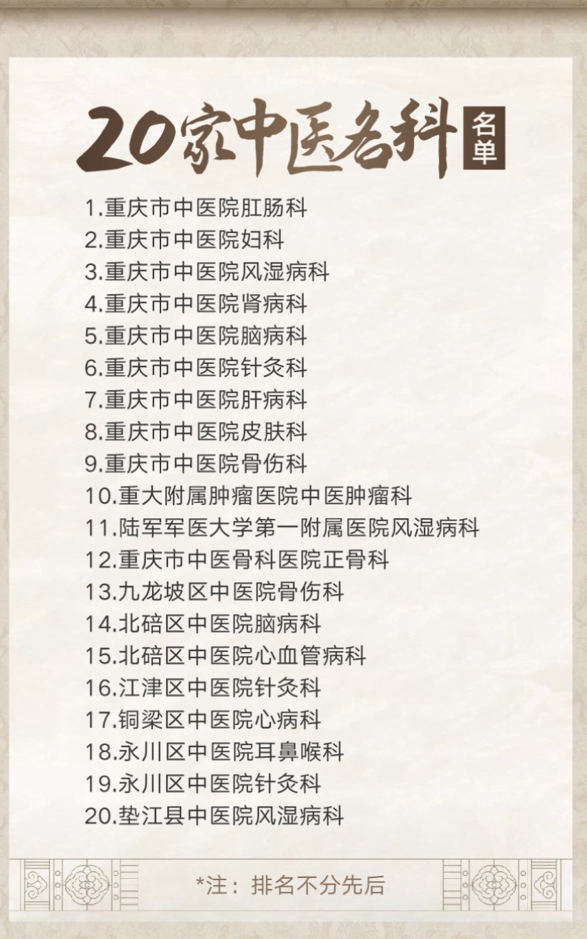 重庆市中医院肛肠科、重庆市中医院妇科、重庆市中医院风湿病科、重庆市中医院肾病科、重庆市中医院脑病科、重庆市中医院针灸科、重庆市中医院肝病科、重庆市中医院皮肤科、重庆市中医院骨伤科、重大附属肿瘤医院中医肿瘤科、陆军军医大学第一附属医院风湿病科、重庆市中医骨科医院正骨科、九龙坡区中医院骨伤科、北碚区中医院脑病科、北碚区中医院心血管病科、江津区中医院针灸科、铜梁区中医院心病科、永川区中医院耳鼻喉科、永川区中医院针灸科、垫江县中医院风湿病科