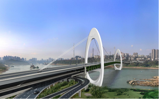 黄桷坪长江大桥主桥为752米的双层地锚式空间索面悬索桥,其主跨550米的设计,使其成为世界上最大跨度的地锚式公轨两用空间索面悬索桥。