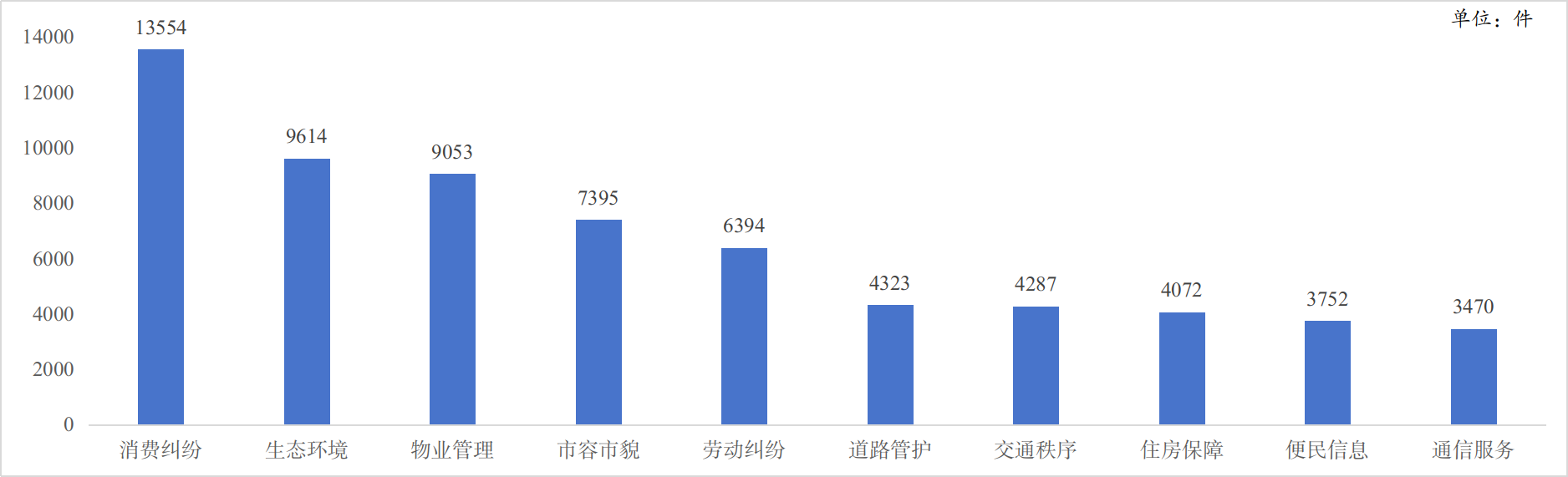 各区县(自治县)和西部科学城重庆高新区、万盛经开区办理诉求热点分析:群众诉求主要集中在消费纠纷(13554件)、生态环境(9614件)、物业管理(9053件)、市容市貌(7395件)、劳动纠纷(6394件)、道路管护(4323件)、交通秩序(4287件)、住房保障(4072件)、便民信息(3752件)、通信服务(3470件)等方面。