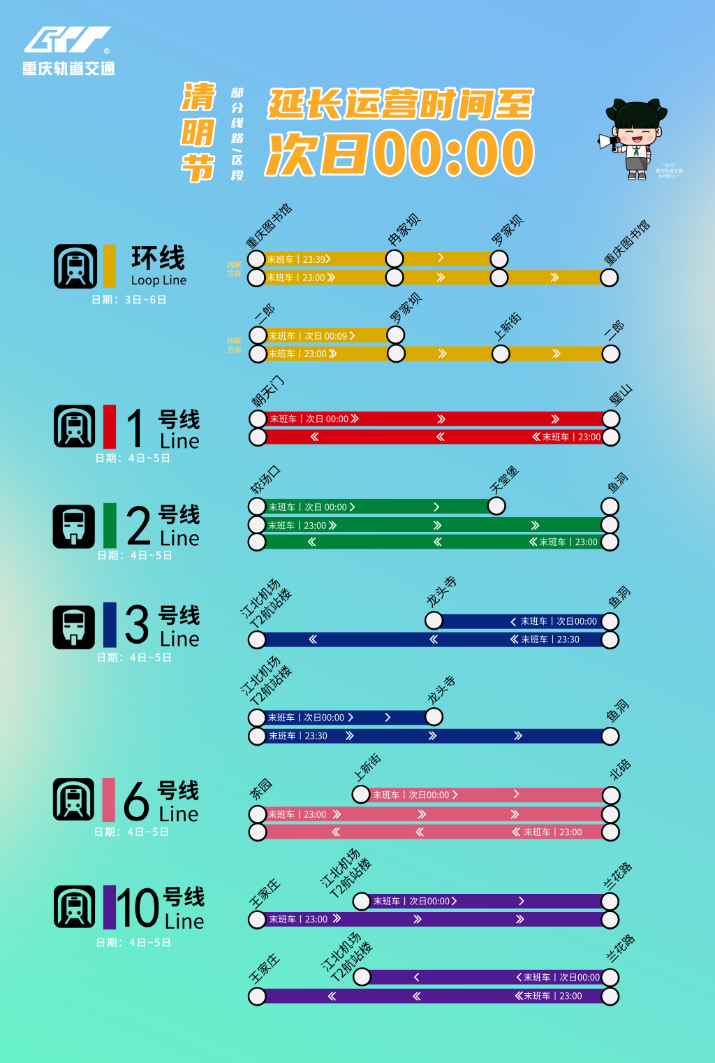 4月1日,重庆交通开投轨道集团发布消息,清明期间,不同线路将采取分方向、分区段差异化延长运营时间等方式,方便乘客出行。其中,多条线路将延时运营至0时。
