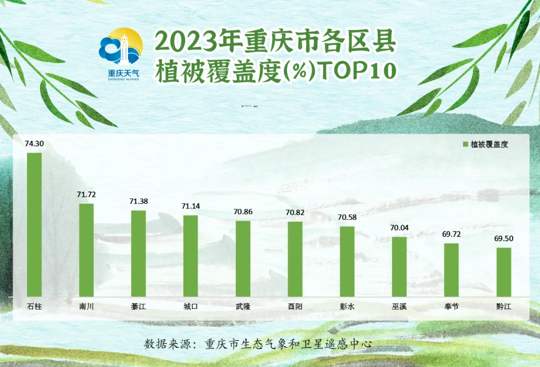 其中,石柱、南川、綦江、城口、武隆、酉阳、彭水、巫溪的植被覆盖度达到并超过了70%,石柱更是以74.3%的植被覆盖度位居全市第一。