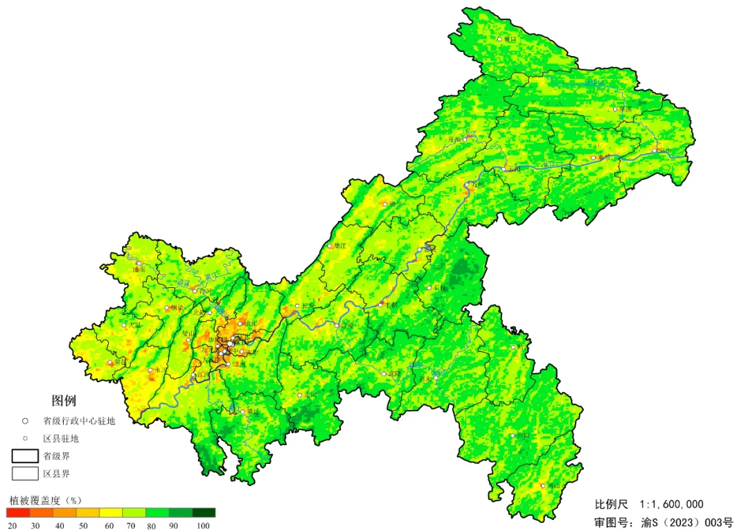 从2023年重庆植被覆盖度区域分布图(如下图)可见,植被覆盖度较高区域主要集中在山区,与山脉走势基本一致。