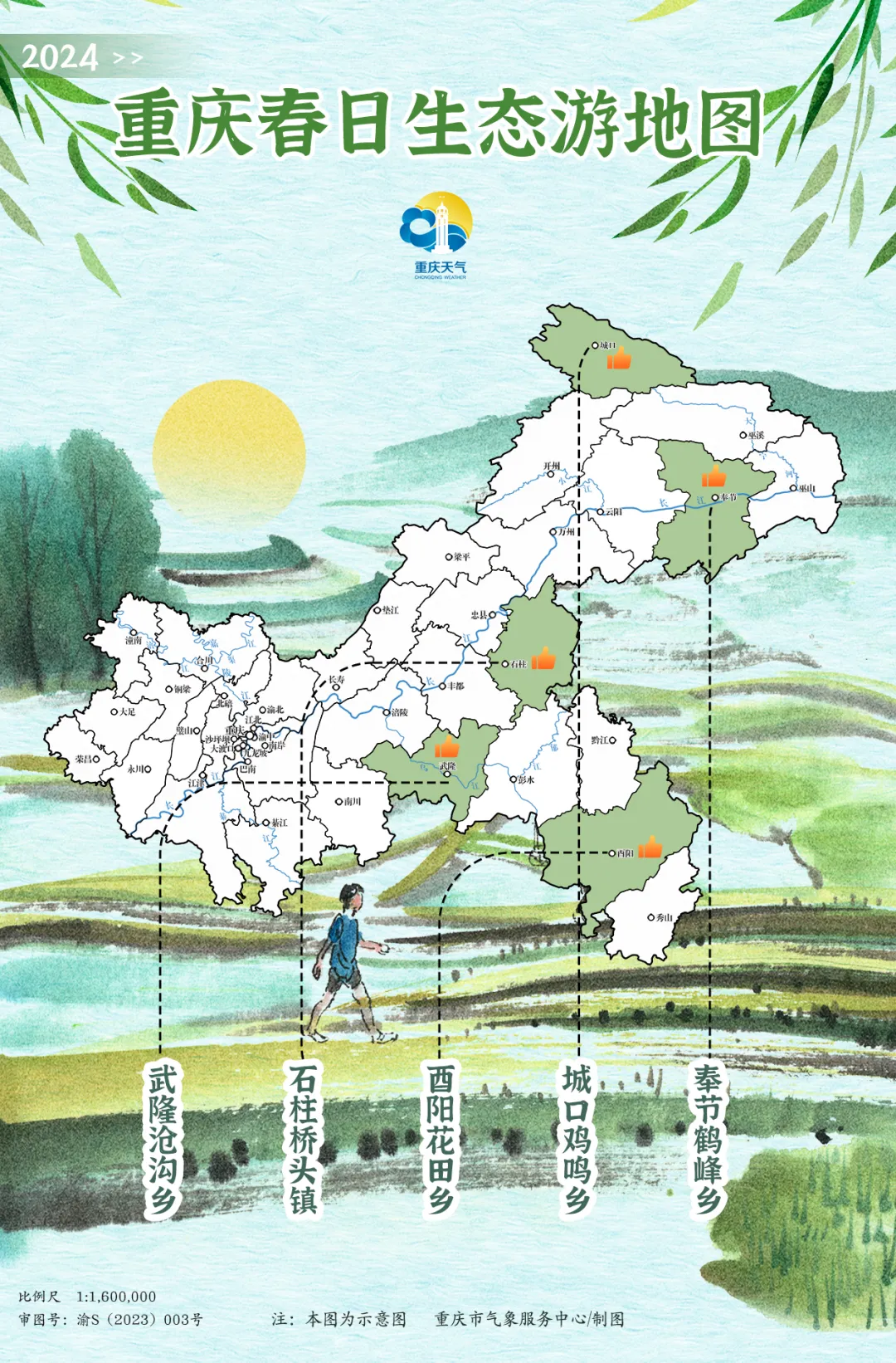 2000-2023年,重庆市植被覆盖度历年变化呈现波动上升趋势,依托优质生态气候资源,近年来,和美乡村生态旅游、森林康养、气候养生等绿色经济蓬勃发展。对此,重庆天气特别制作《2024年重庆春日生态游地图》,并优选五大和美乡村,助你开启2024春游生态之旅!