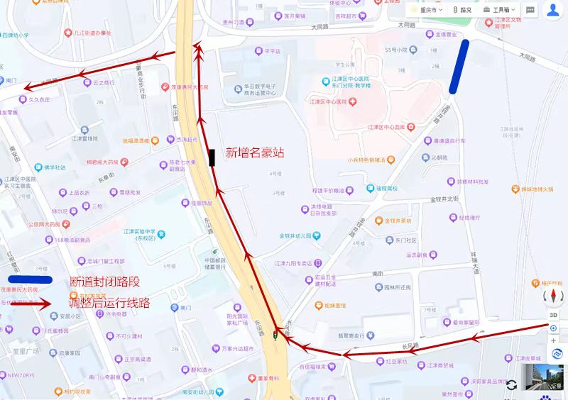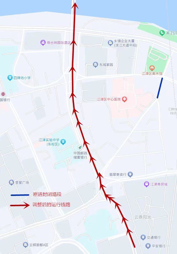 (5)205路从江津中学(滨江校区)站发往琅山公交首末站方向按原线路运行。从琅山公交首末站发往江津中学(滨江校区)站方向,在停靠云鼎阳光站后直接上几江长江大桥,不再停靠金钗井站和东门医院站。如图所示: