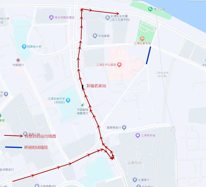 调整后的运行站点:金江港湾站—儿童医院站—区中心医院站—西西里(沁园春)站—星韵满庭站—琅山社区站—中昂新天地站—东关路口站—长风(津城壹号)站—义乌商贸城站—名豪(金钗井)站—东门口站—佛学社站—奎星广场站—几江幼儿园站—小官山站—城南站—长城路口站—师部站—西关路口(西城小学)站—长城路菜市场站—金竹村站—几江实验小学站—大西门社区站—江岸丽都站。