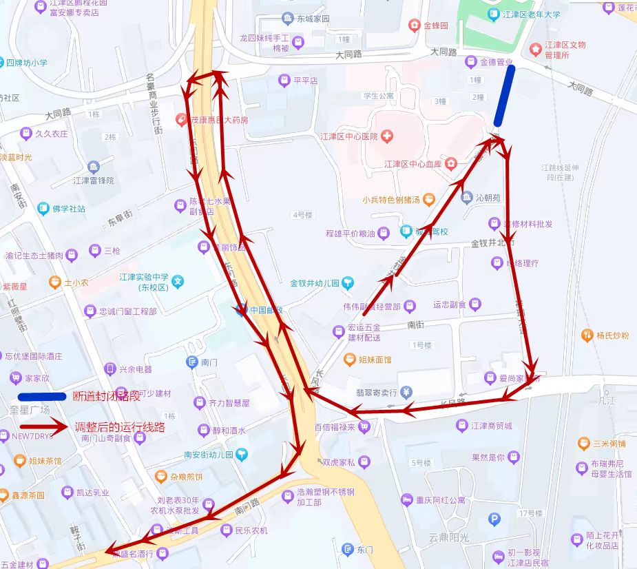 (6)501路从市铁圣泉寺站发往先锋(平安街)站方向按原线路运行。从先锋(平安街)站发往市铁圣泉站方向,在停靠云鼎阳光站后直接上几江长江大桥,不再停靠金钗井站和东门医院站。如图所示: