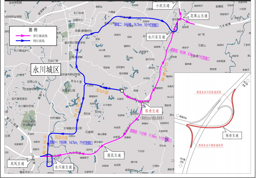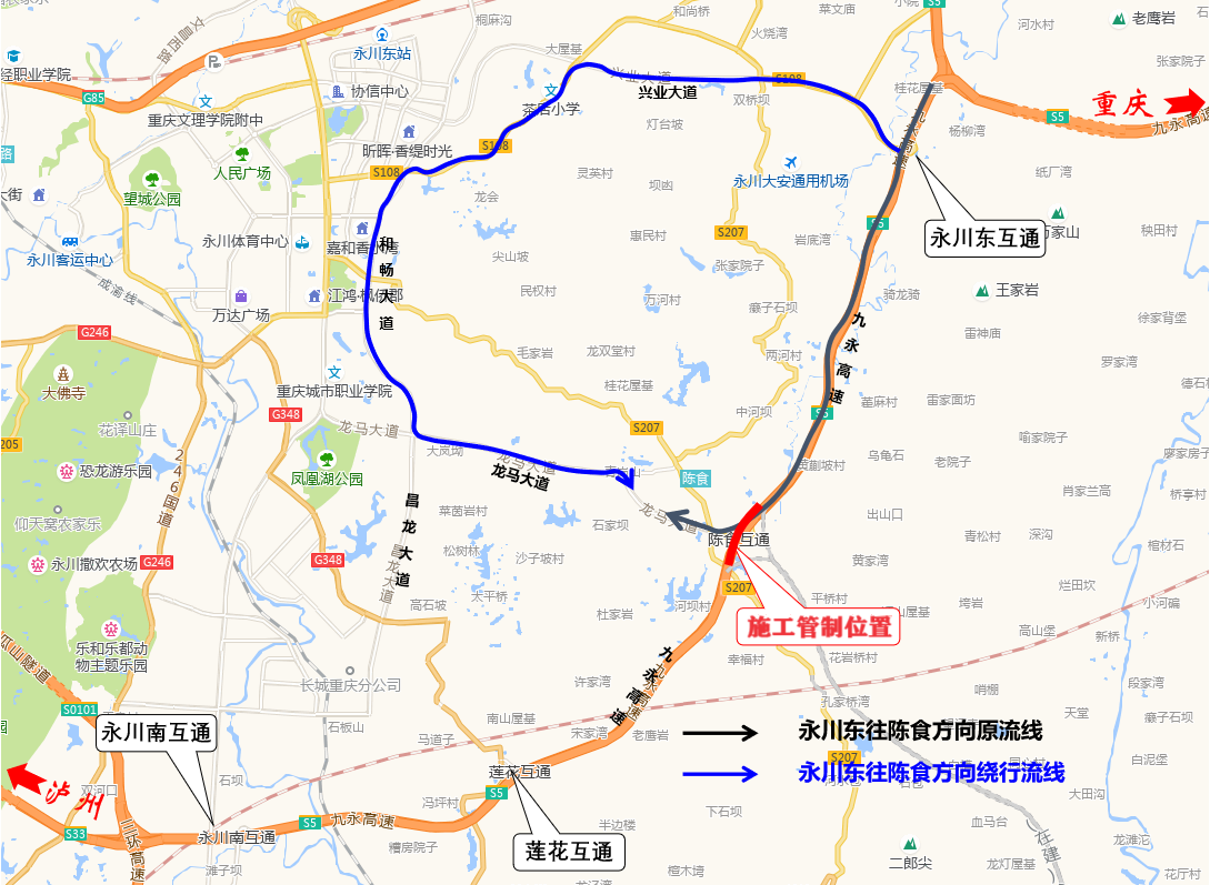 1.出城(永川东至陈食匝道)方向需要在陈食收费站下道车辆绕行线路:永川东互通→永川东收费站→兴业大道→S108→和畅大道→龙马大道→陈食,已过永川东收费站车辆请到莲花收费站掉头往进城方向陈食互通下道。