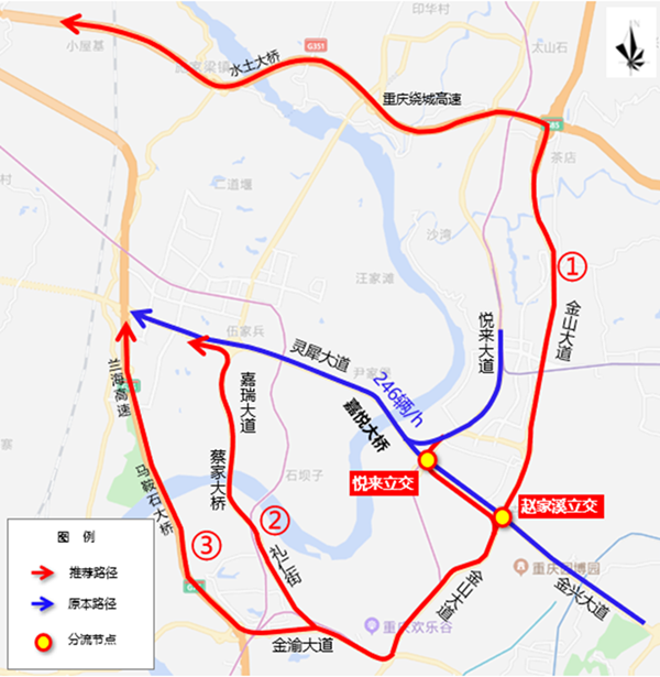 (三) 绕行线路:经金山寺立交往北碚区方向的车辆,改道礼仁街→金渝大道→兰海高速→灵犀大道→嘉瑞大道;或改道礼仁街→金渝大道→金山大道→金兴大道。