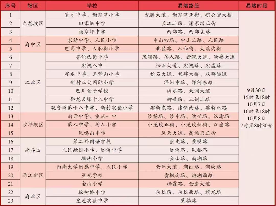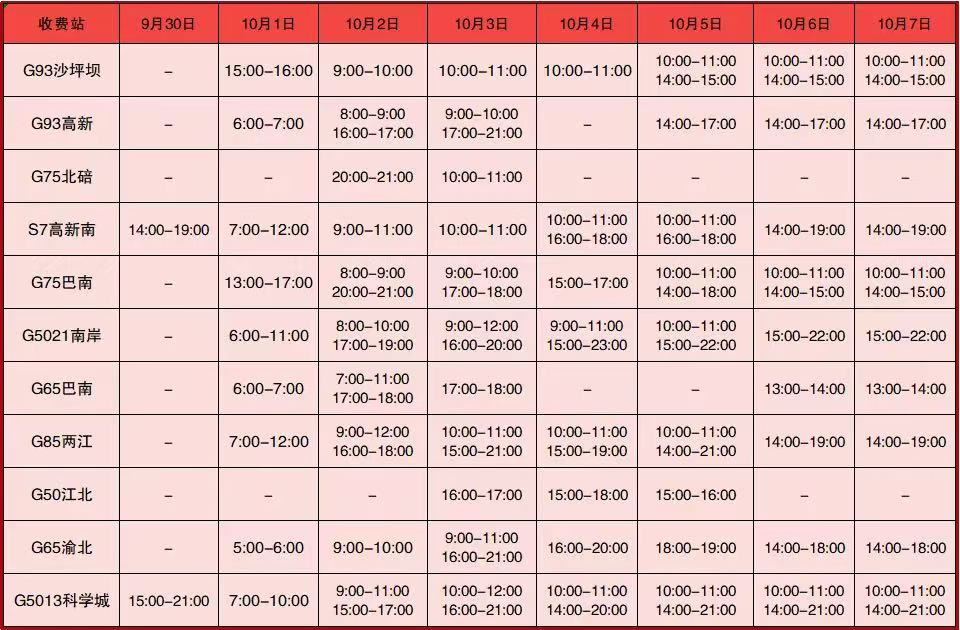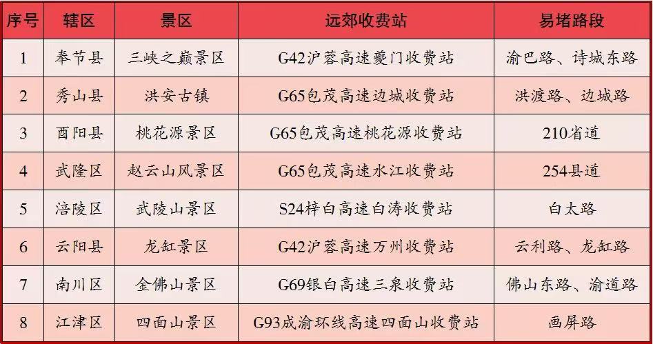受学生放假、务工返乡、跨市跨区旅游等因素影响,9月30日至10月2日将迎来出行高峰,星光至北环立交、四公里至江南立交、新华至华岩立交、凤中至西环立交、北环至石子山立交、西环至凤中立交、巴南至太阳岗立交、高滩岩至西环立交、鹿角至雷家桥立交等路段将出现车流积压现象。