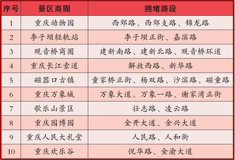 节日期间将有大量外省游客来渝旅游,景区商圈将迎来人车流集中出行高峰,预计白天拥堵时段主要集中在10时至17时,夜间拥堵时段集中在20时至23时。
