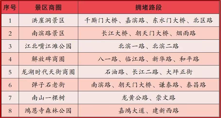 夜间时段,市民夜游赏景、聚餐聚会,预计渝中区洪崖洞景区周边的千厮门大桥、嘉滨路、东水门大桥、北区路,南岸区南滨路景区周边的长江大桥、朝天门大桥、烟雨路,江北区江北嘴江滩公园周边的北滨一路、北滨二路等主要道路易出现拥堵缓行。