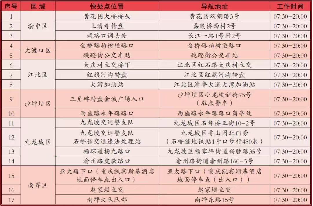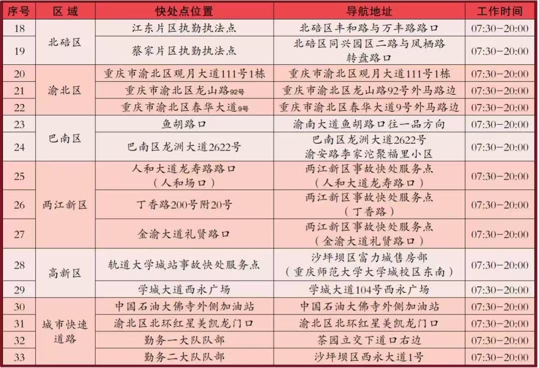 此外,节日期间,我市中心城区共设置33个道路交通事故快处服务点,服务点位置、公开电话、工作时间等信息已在互联网导航和“交管12123”APP系统上进行标注,方便群众快速处理轻微事故,中心城区道路交通事故快处服务点详见下表: