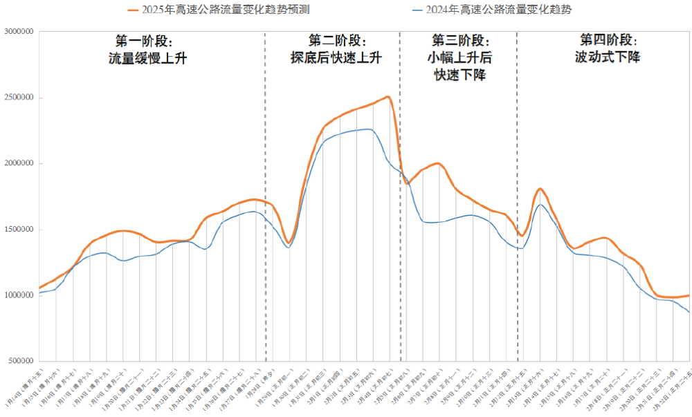 第一阶段(1月14日至1月27日),春运启动后人流、车流、物流加快加速,高速公路流量缓慢上升,预计在1月27日将迎来节前出行最高峰。