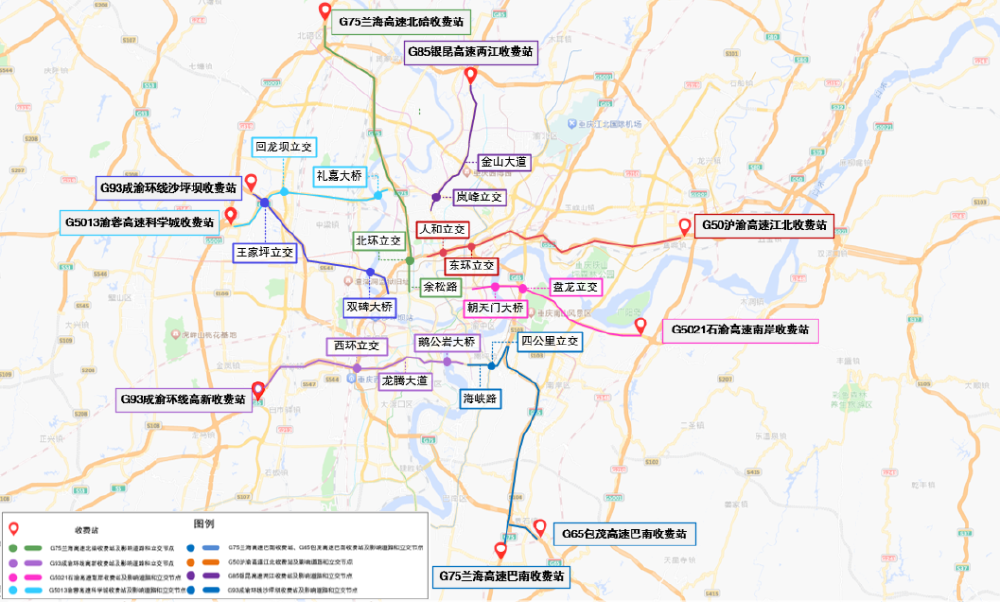 其中,渝东北片区G69银百高速五桥收费站(万州)、G5012恩广高速开州收费站、G42沪蓉高速云阳收费站;渝东南片区G65包茂高速黔江南收费站、G65包茂高速彭水西收费站;渝西片区G85银昆高速永川收费站、G85银昆高速荣昌西收费站、G93成渝环线铜梁北收费站等区县收费站易出现车多缓行情况。