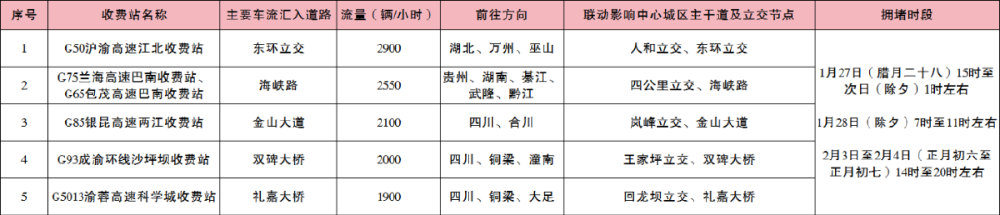 春节前后,因外省大量务工人员和主城市民提前返乡,加之区县重点乡镇将迎来大量赶场聚会、走亲访友和农村民俗活动,预计区县收费站车流量将明显增加。
