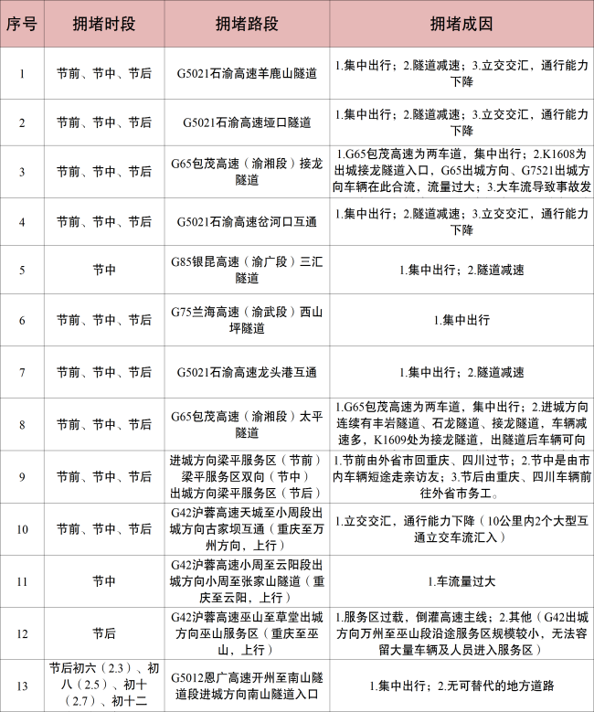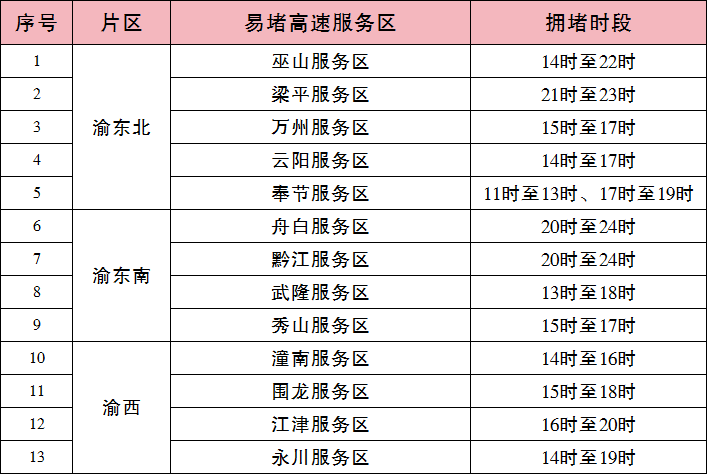 春节前后,随着路网车流量大幅增加,高速服务区充电桩在高峰时段易出现车辆排队等候情况,预计我市渝东北片区万州服务区、云阳服务区、梁平服务区、忠州服务区,渝东南片区黔江服务区、武隆服务区,渝西片区潼南服务区、围龙服务区(铜梁)等高速服务区将出现拥堵缓行情况,易堵服务区及拥堵时段详见下表: