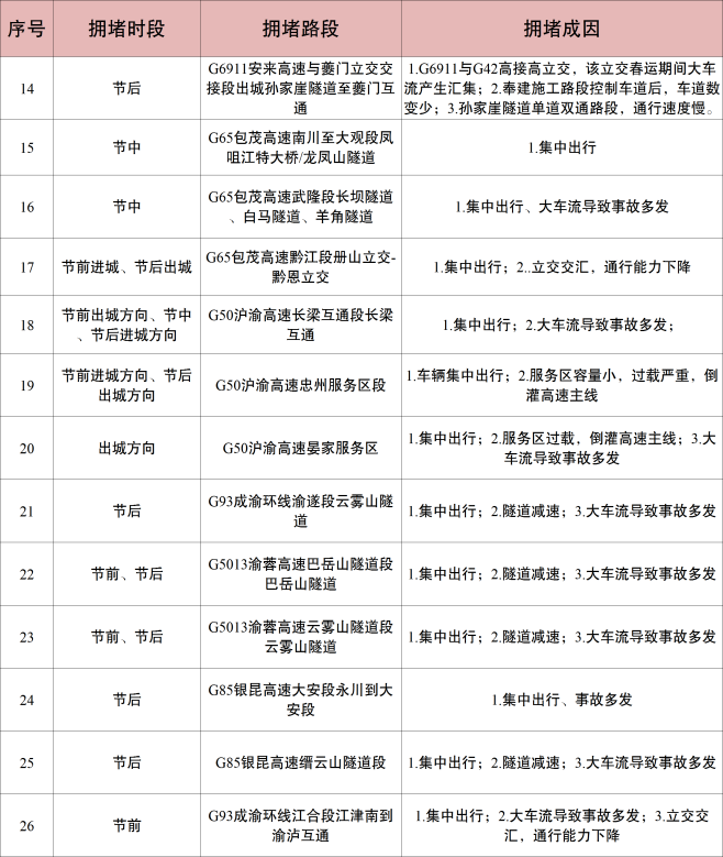 六是从“云南片区”经四川方向往返我市的G93成渝环线等我市省际高速主要通道将迎来跨省车辆出行高峰。