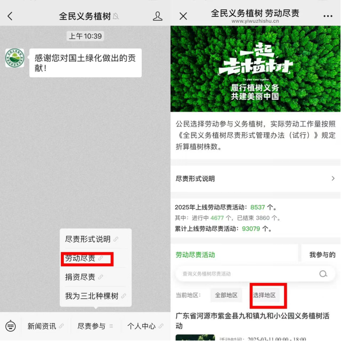搜索全民义务植树微信公众号,点击下方菜单栏“尽责参与”,在弹出的菜单栏里点击“劳动尽责”,跳出页面后点击“选择地区”,选择适合的基地,点击“我要参与”,填写个人信息,点击“确认提交”后等待管理员审核。