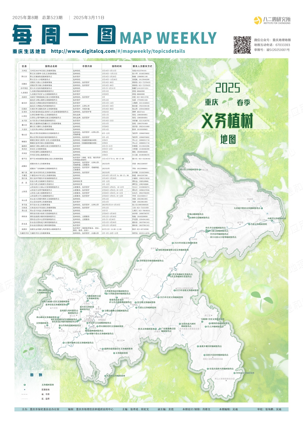 此外,重庆市绿化委员会办公室重庆市地理信息和遥感应用中心共同推出了《2025重庆春季义务植树地图》,选择线下预约前往的市民可提前致电义务植树基地联系人,确定好植树的具体日期和方式后自行前往基地↓↓↓