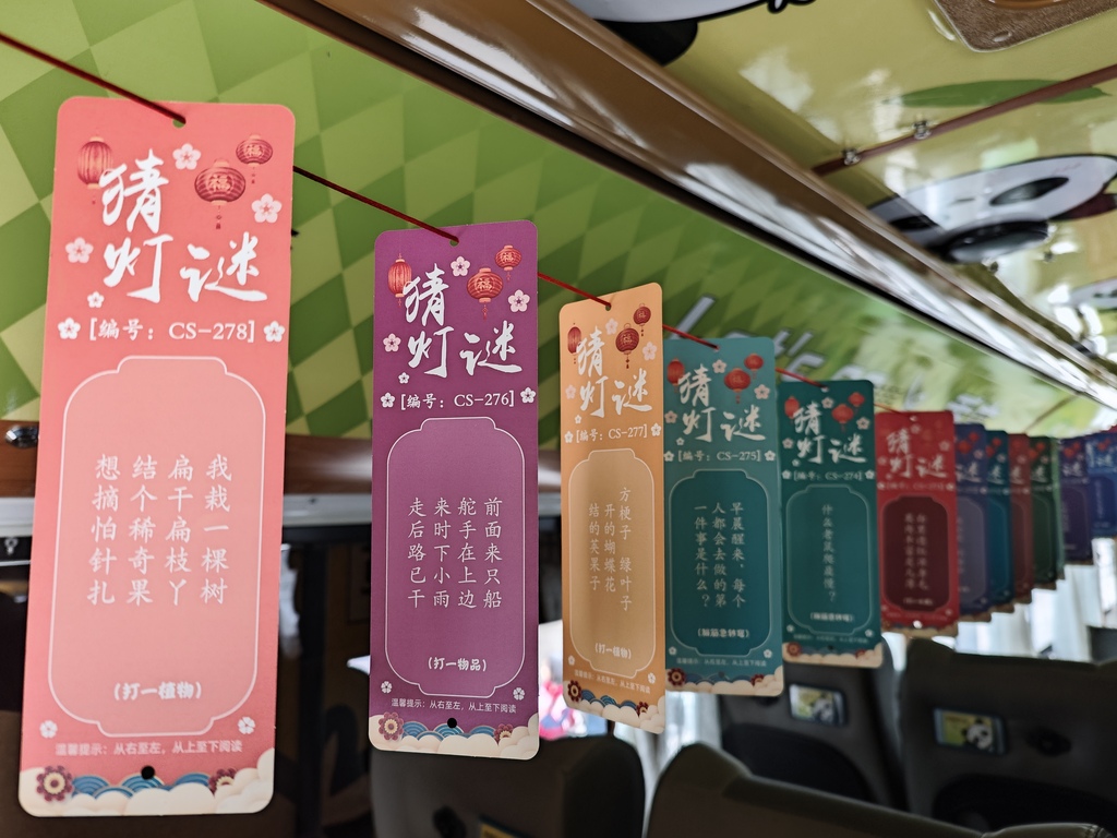 随着春节临近,“熊猫巴士”已装扮一新。车厢内不仅增加了趣味猜谜有奖活动,游客还可在车上K歌,在移动观景中解锁新体验。