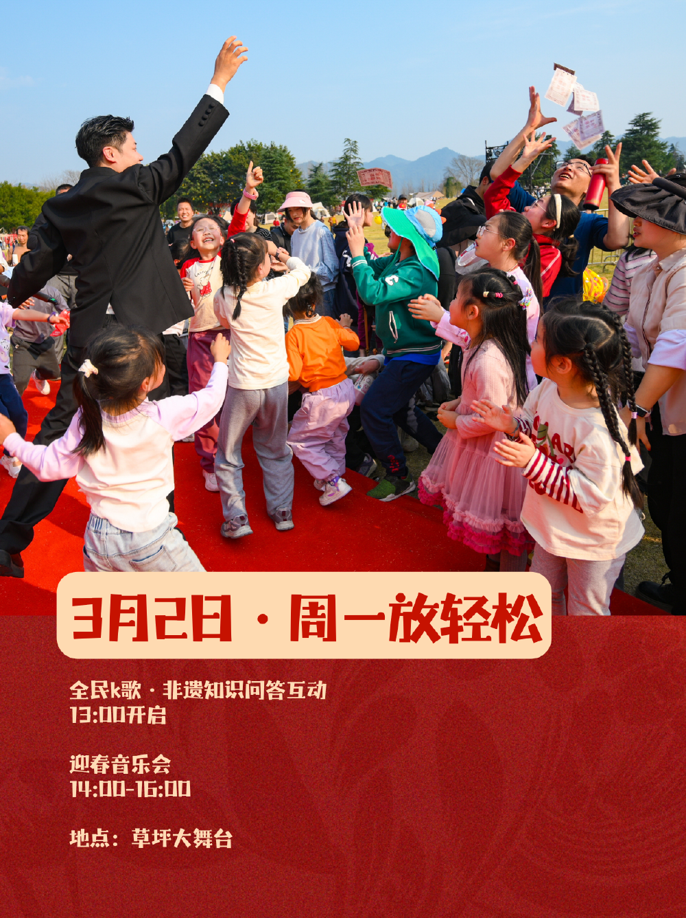 3月1日-2日,公园将推出欢乐互动舞台、迎春音乐会、魔术表演、非遗木偶戏等活动;3月3日11:00起,“国风游园会·新春照相馆”将限时返场,现场可与汉服NPC互动赢“银票”,有机会得新春免费全家福;3月3日19:00-20:30将有百米舞龙、打铁花、战鼓舞等现场表演。