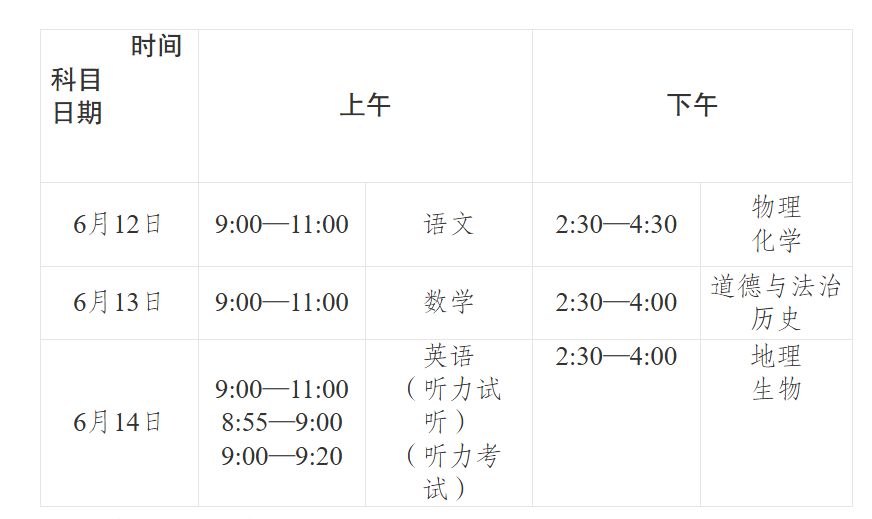 考试时间为2026年6月12日至14日,具体安排为:6月12日上午9:00-11:00考语文,下午2:30-4:30考物理、化学;6月13日上午9:00-11:00考数学,下午2:30-4:00考道德与法治、历史;6月14日上午9:00-11:00考英语,下午2:30-4:00考地理、生物。