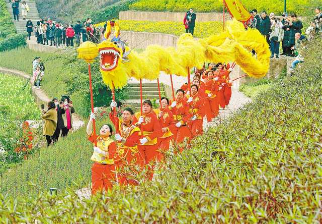 图③:1月22日,璧山区古道湾公园梯田花海,非遗表演者舞草龙再现田间丰收场景,吸引游客驻足欣赏。特约摄影 谢捷/视觉重庆