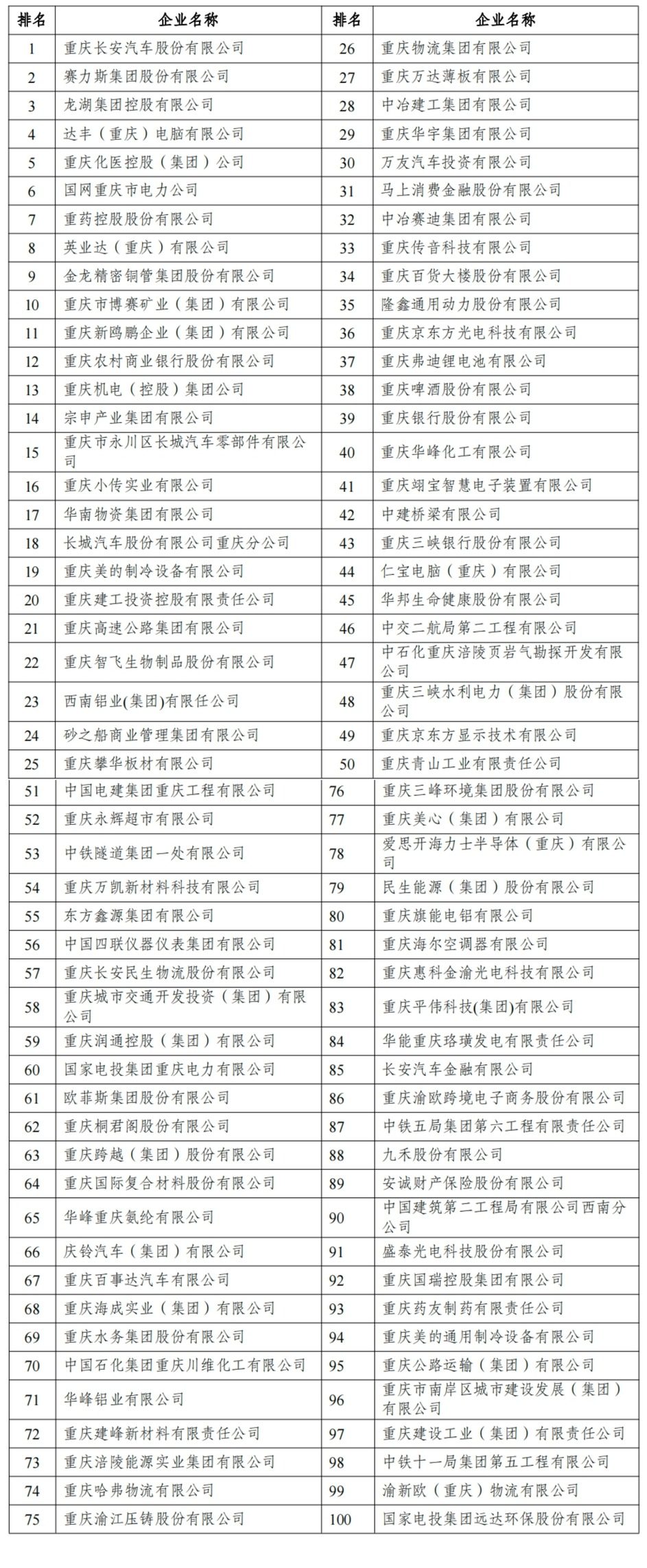 “100强企业在一定维度上体现重庆经济高质量发展态势和实力。”市企业联合会负责人表示,从上榜企业总体情况看,重庆制造业基础雄厚,产业链条完整,特别是在智能网联新能源汽车、新一代电子信息制造业、装备制造等领域已经形成集群优势。