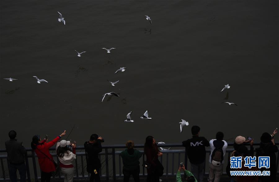 11月5日,人们在重庆弹子石码头观赏红嘴鸥。 新华社记者王全超摄