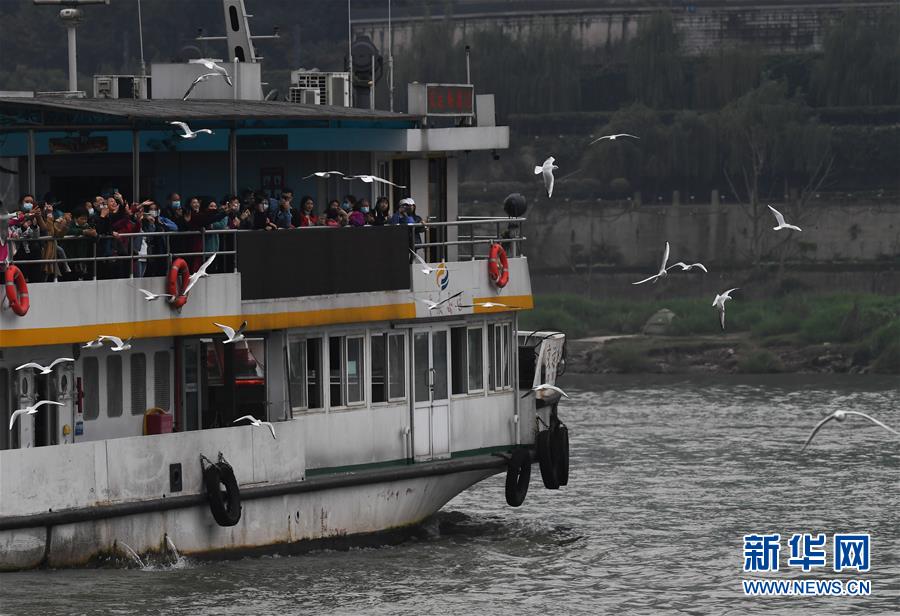 11月5日,乘船游览的游客在重庆朝天门码头附近观赏红嘴鸥。 新华社记者王全超摄